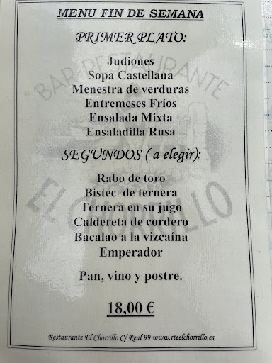 Read moreLa terraza está bien montada aunque demasiado pegada a la carretera. Por suerte no tiene mucho tráfico. Tomamos el menú fin de semana por 18€, con 6 primeros y 6 segundos a elegir. Probamos la ensaladilla rusa (decente) y los judiones (demasiado densos, muy espesa la salsa). De segundos rabo de toro, ternera en su jugo y bacalao a la Vizcaína (con tomate, que no es la receta purista pero estaba muy bien hecho). Todos los segundos muy buenos. Postres caseros, a destacar el flan de queso y el arroz con leche. Calidad/precio aceptable. Los platos combinados que tienen en la carta son muy abundantes por 6€ o menos. Buena opción también.