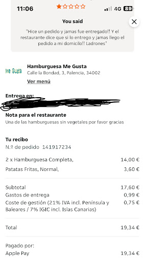 Read moreque falta de servicio tienen te dicen de 1hora de espera y cuando te quejas porque viene más tarde te dan opción a que las cogas o no las cogas y te cuelgan el teléfono porque se les quema la plancha y te anulan el pedido por haberte quejado..llamas para reclamar el pedido y te dicen que no que te disculpes o sino no hay pedido porque yo soy una mala educada por decirles que si les parecería bien que por venir tarde no les pagaría el pedido,,, pero aquí la mala educado soy yo por decirles que han quedado sin cenar a unos niños que llevan esperando hora y media y lo hay no queda la cosa llamas para poner una reclamación y el listo de uno me dice que salga al pasillo y vaya al baño hay se ha visto el respeto que tienen por los clientes,,se acabo de pedir en este establecimiento faltas de respeto y de...