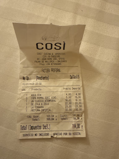 Read moreCosì Cucina & Aperitivi is a gem on the beautiful island of Mallorca. From the moment you step into this charming Italian restaurant, you are greeted with warmth and a level of service that is nothing short of exceptional. The staff is not only incredibly friendly but also remarkably attentive, ensuring every aspect of your dining experience is flawless.