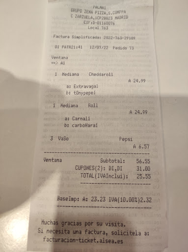 fuimos hace un año una familia de 8 personas, no volvimos más, por qué el trato fue muy asqueroso, no hablaron muy mal, la tía super bordes, acta le pedimos una hojas dereclamaciones, estando hay preguntamos, quien es el encargados acta mal no hablaron, Yo entiendo que cada quien trabaja por una necesidad, y si trabajas del cara al público devén de estar lo más alegres, aunque sea sus sonrisas falza, si vamos a un restaurante es para pasarla bien, no es para salir desgustado, mi motivo de la 5 estrellas, por qué fuimos el viernes 7 personas a cenar rápidos, por qué teníamos un vuelo para Barcelona y el Domino's pizza, Eras el que más cerca estava, le dijimos a nuestro amigos, que no queremos hir, como nunca avían probados la pizzas querían probarla, el trato en la terraza fue estupendo muy agradable, luego de llegar a Palma invitamos a mi madre y a mis hermanos y mis cuñados fuimos 9, y no atendieron de maravillas, no duramos más de 4 minutos para atendernos, fues muy rápidos, la cena llegó muy rápidos, y la tención nunca falto, hay una chica que se llama Valentina, o balentina color mulatas morenita delgadas, no atendió de maravilla no fuimos contento y por esa atención, le recordamos invitamos a más personas, deberían de hacerse eco de la buena atención, y personas como Valentina deberían aver más y valorar el trabajo que hacen, Y NO le doy 6 o 7 estrellas, por qué no hay más, no a gustado, saludos y espero que...