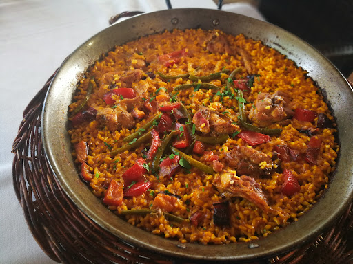 Paella valenciana "sin caracoles" en carta, pedimos una para dos; mientras tanto, nos traen dos panecillos, un mini bol con aceitunas y dos trocitos de coca de trampò "mientras se va haciendo la paella..." La atención es muy correcta y atenta. Llega "el arroz" por llamarla de alguna manera ( llamarlo paella es un insulto....) Pimiento rojo, algo de pollo, conejo y alguna judía fina ; ni rastro de alcachofa, ni baxoqueta, ni ferraura, ni garrofó ni "na de na" ; la ración es excesivamente pequeña para dos comensales; el arroz, suelto y en buen punto de cocción pero insipido y excesivamente aceitoso.