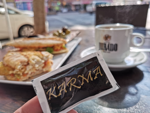 Por otro lado, ¿qué es el karma? Es un nombre muy bien escogido para esta cafetería. El significado es de sobras conocido, pero lo comento para contextualizar la reseña: en varias religiones y filosofías orientales como el hinduismo o el budismo, el karma es una energía que lo envuelve todo y que hace que las acciones morales que se realizan tengan un retorno del mismo estilo hacia la persona que las ha hecho. Es decir, es una especie de mecanismo de compensación metafísico.