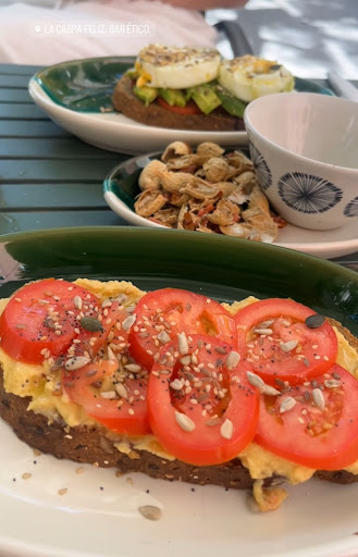 I bumped into this new little add in one of my favourite area in town, Calle Blanquerna, only by chance...I was walking around this beautiful pedestrian area, not fully knows from the tourists yet, wondering a coffee or something different to boost up my morning. All the sudden I couldn't spot anymore my regular cafeteria but instead there was a new interesting business. Overlooking the busy terrace already at 10am I noticed the sign that attracted my attention right away from the name and the meaning " La cabra feliz ... Bar etico " ( The happy goat ethic bar ). Intrigue from the sign I walked in to find out what was about.