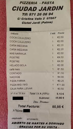 Read moreDesde entrantes como los nachos, pasando por platos principales como las pizzas, hasta llegar a los postres, como la tarta de oreo, todo esta buenísimo. Las pizzas, de un tamaño considerable para una persona, se pueden compartir, hecho que sube el precio de la misma hasta 11,9€, siendo ése el precio más caro. Nosotros hemos pedido media Diabolo y media Ciudad Jardín, y todo perfecto, sin mezclarse sabores, ni nada raro. Hoy, un domingo de octubre, para comer hemos encontrado mesa sin tener que esperar, y eso se agradece. Como punto negativo diré que ya cuando estábamos acabando ha empezado a hacer algo de calor, y no han puesto aire acondicionado o ventiladores para mitigarlo, siendo por este motivo por el que nos hemos tenido que algo antes de lo que nos...