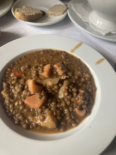 Le porzioni, nonostante l’apparenza, sono davvero abbondanti. Come benvenuto ci hanno portato “pan y aceitunas” (pane, olive e grissini con un tipico accompagnamento). Come antipasto abbiamo scelto la “sepia con sofrito”: a prima vista sembrava poca, ma in realtà era più che sufficiente per saziare due persone. Ottima e ben condita, la consiglio vivamente. Come secondi abbiamo ordinato un’entrecôte molto saporita e la “paletilla de cordero”, entrambe servite con verdure e patate (fritte e al forno, rispettivamente). Anche questi piatti si sono rivelati eccellenti e abbondanti. Per concludere, ho preso una buona crema catalana.