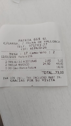 Read moreMixed experience! The food is great. The pricing tactics are dodgy. The service could be a bit more defined. The range of wines is good. We took a local Mallorcan white and it was superb. You can not order food at the table and need to go to a kiosk inside the restaurant. Not too helpful if you came together with family and need to discuss options with them before ordering. I ordered a paella. It was great! Tasty, huge portion. The trick is that one will be charged for two paellas, as there is a condition that two servings is minimum to order. Not too handy with a menu available on a plate above the “kiosk”. They offer “bread, olives,…” when they bring wine. Non of us is a fan of olives and mayo, so, we said “some bread would be fine”. They brought that set with olives and mayonnaise and included that in the bill. And, certainly we did not manage to finish two paellas, as we fancied only one. So we asked to put it into a take away container. They happily offered this service. When we paid the bill, the waiter came back to us without the take away paella to apologize that it was discarded at the kitchen by mistake. They offered a compensation in the way of a coffee or wine. Too bad we did not want any. Just left the venue laughing at ourselves. Certainly we needed to be more attentive in reading the menu which clearly stated that the portion and the price will be...