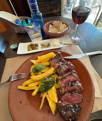 Read moreExactly what I love, a busy lunchtime, bar stools all occupied with locals and tourists alike, enjoying a caña y tapas. Although at capacity, the friendly waitress found me a snug corner barrel table with high stools to sit at, whereby I ordered the Entrecote 'en su punto, a glass of house red and a sparking water. I was offered some delicious apparently home made bread, thick cut, crispy crusted and dense and fluffy inside, not the usual boring stale baguette normally provided in such places. The Alioli and aceitunas were delicious. The steak arrived sizzling hot and sliced, on a terracotta plate; a thick streak of juicy fat along its flanks, and incredibly tasty and succulent with flaked salt. The meat came accompanied by fat chips, above average and crispy/fluffy, and a few pimientos de Padrón as a garnish.