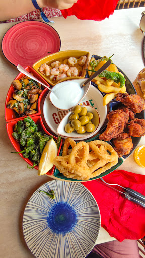 Food: We ordered the tapas platter for two (18€ per person), which was served on a rotating tray with individual bowls containing a variety of mouth-watering dishes. The waiter help us what to select. Our platter included pimiente de padron, crispy fries, chicken wings, grilled garlic prawns in oil, garlic mushrooms, and Catalonian fried calamari. Accompanying the platter was a creamy garlic dip that complemented the flavors of the tapas perfectly. The platter also included tasty green olives with pits.