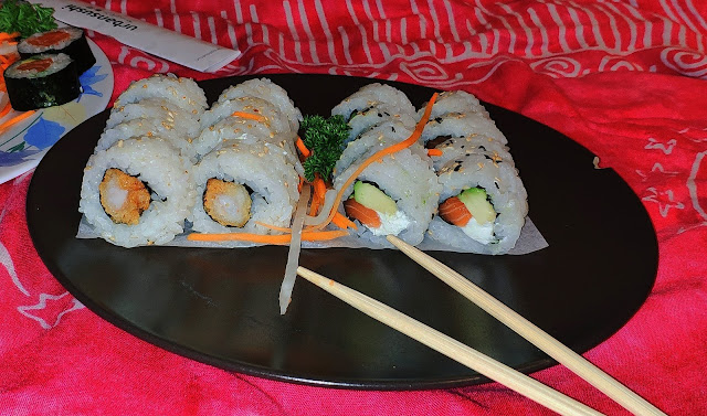 Partamos de la base de que no me gusta comer a domicilio la mayoría de comidas pierden sus virtudes al tener que traerlos y la forma de servirlo que se limita a envasar el plato en tappers de plásticos o en cajas de cartón. Así que cuando pedí sushi a domicilio,debido a una interesante oferta del 50% de descuento en una selección de sushi,no esperaba encontrar gran cosa.
