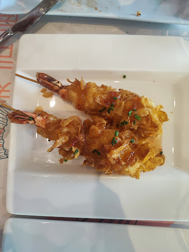 Para empezar, compartimos dos entrantes: unos langostinos en tempura de corn flakes, con una salsa agridulce que estaba para chuparse los dedos, y unos rollitos de verduras envueltos en una pasta filo superfinita. ¡Ambos nos sorprendieron mucho!