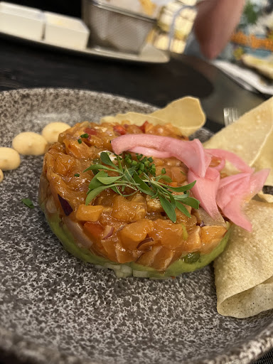 La nostra visita è iniziata con una selezione di antipasti: tartare di salmone, tacos giapponesi e gamberi all'aglio. Ogni piatto era gustoso e intensamente saporito. La tartare di salmone era fresca e ben condita, i tacos giapponesi offrivano una fusione interessante di sapori, e i gamberi all'aglio erano cotti alla perfezione e aromatici.