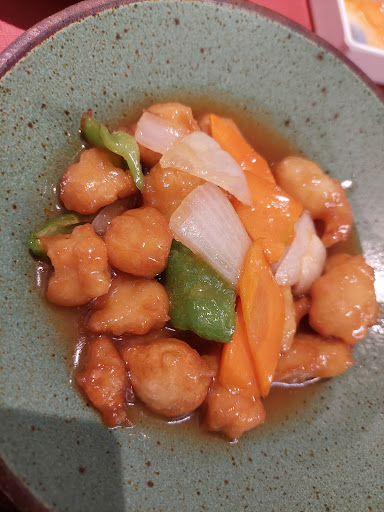 La comida buenísima, los platos muy abundantes, hay salsa de soja y wasabi, la agridulce sólo si pides platos que la tengan.