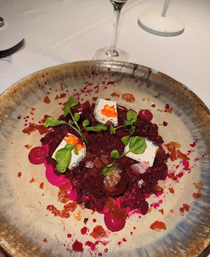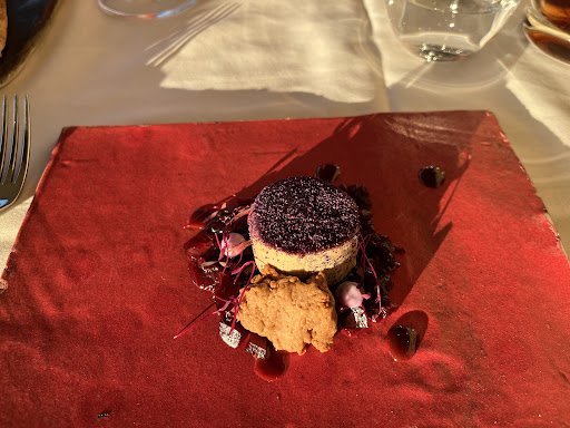 Un bloque de pularda que no tiene ningún sentido flotando en una sopa de tomate (además de ser bastante insulso). El tartar de remolacha y el huevo quizás se salvan porque uno es fresco y combina bien (remolacha y queso), y el otro porque por muy sofisticado que parezca es muy difícil que un huevo poché con patata y polvillo de seta sepa mal.