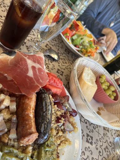 First stop after the long winding drive up the mountain and wonderful attentive and friendly smiles greeted us. The food was excellent, Migas were a feast and the polenta was light and delicious with a huge helping of various jamon and sausage. We got a “small” salad to share and it was a mound of delicious fruit and vegetables that was more than enough for 3. The friendly gato seemed to follow us all over town and it hangs out on the veranda overlooking the front of the town and the passing...