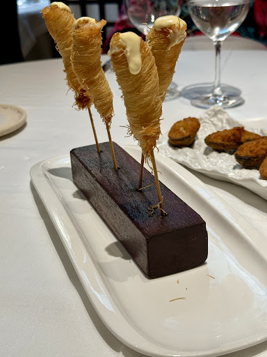 Empezamos con unos divertidos conos crujientes rellenos de gamba y coronados con una suave crema, servidos de forma muy original sobre un bloque de madera. Un aperitivo ligero y sabroso que abre el apetito de la mejor manera. Le siguieron unos tigres (mejillones rellenos y rebozados) que estaban en su punto: jugosos por dentro, crujientes por fuera, de los que invitan a repetir.