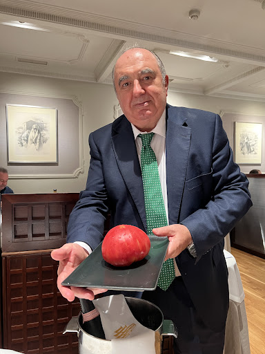 En el apartado de carnes, la velada fue subiendo de nivel. El tataki presentado en cortes finos y acompañado de salsas y toques verdes, fue de lo más elegante y equilibrado. Después llegó un plato muy especial: el arroz meloso con pichón, donde la intensidad de la carne se fundía con la cremosidad del arroz, una combinación redonda. Y como plato fuerte, el solomillo con pimientos de Padrón y patatas fritas caseras, carne en su punto justo, jugosa y sabrosa, que hizo las delicias de la mesa.