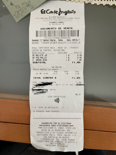 Read moreExperiencia nula, no pongo 0 estrellas porque no se puede. Experiencia del 29 de noviembre a las 10.15, restaurante prácticamente vacío, solo 8 mesas ocupadas, y mesas de 3 a 4 personas, se podía dar un servicio rápido, ya sabemos que El Corte Inglés no tiene un servicio muy rápido, pero no tan lento de esperar 30 minutos entre pedir y servir dos cafés y dos tostadas (por cierto, todo frío). En ese tiempo de espera se fueron 3 mesas sin servirles. Me tuve que levantar a decirle a una de las camareras que necesitábamos algo de comida ya porque una de las personas era diabética y estaba teniendo una bajada de azúcar por la espera de 30 minutos. A lo que la camarera NURY ACEVEDO me contestó de muy malas maneras: No ves que estamos completas o no te das cuenta? Eso son formas de atender a un cliente? Para ser El Corte Inglés esa contestación está muy fuera de lugar. Y menos a un cliente no se le puede contestar NUNCA de esas formas. A pesar de toda la espera no tuvieron un detalle con nosotras ni pidieron disculpas. Con personal así vais a perder mucha clientela. Vergonzoso el servicio. Y por lo que he leído en otros comentarios hay más gente con esa experiencia en este restaurante. Para 11 euros que pague de desayuno, poca cantidad, frio y mal servicio, sitio que no volveré nunca, prefiero cualquier otra cafetería del entorno que volver ahí. Y estaría encantada de hablar con el o la responsable de la cafetería de El Corte Inglés y contarle mi experiencia tan desagradable. Adjunto foto del ticket para que vean que tardaron bastante en atenderme, en servirme y en cobrarme, una hora de mi tiempo pérdida en un sitio que encima me fui con muy mal sabor de boca y muy mala...