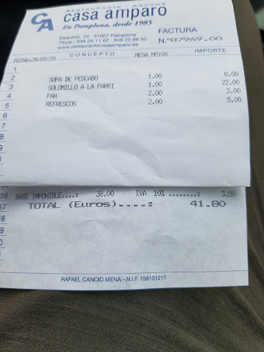 Read moreProbablemente de los sitios de mejor verdura de Navarra. Llevo muchos años comiendo en casa Amparo y siempre ha mantenido ese ambiente de comida rica y de mucha calidad que le hace ser distinto y produce buenas sensaciones al paladar. Los espárragos frescos en temporada son los mejores que probé nunca.. y el resto de la verdura en sus respectivas temporadas son maravillosas. Una cocina honesta y que no defrauda; buenos arroces, carne, pescado y siempre fuera de carta sugerencias que son muy bien recibidas.. su ensaladilla es espectacular. El precio acorde a la calidad de lo que comes. Es sin duda mi lugar de referencia en pamplona.