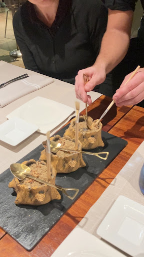 🥙COMIDA: Pedimos primero el pintxo de trufa ganador de varios concursos de pintxos y lo RECOMIENDO! Encima Sergio, el camarero, lo explica y se ve cómo cuidan hasta el último detalle. Luego pedimos tres platos para compartir que fueron las croquetas, la tempura y la ensaladilla rusa y ambos tres están muy bien, tanto de cantidad como de sabor, los recomiendo. Luego pedimos cada uno un plato, entre ellos la ensalada de quinoa, que estaba buena pero le faltaba un poco de sabor; la lubina que estaba muy buena; dos hamburguesas que estaban muy muy ricas y de cantidad generosa, se nota la calidad del producto; los buñuelos de bacalao súper buenos, aviso que son picantes; las carrilleras que estaban también muy ricas; y el taco de bacalao confitado que también muy bueno. Finalmente probamos la tarta de queso y el tiramisu y debo decir que este último estaba espectacular.