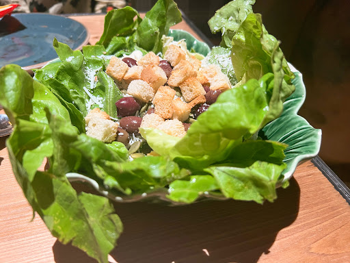 Nuestra cena en Grosso Napoletano comenzó con una ensalada César que, al llegar a la mesa, nos impactó por su presentación, con las hojas de cogollo formando una especie de balón. Sin embargo, lo que llamaba la atención por su belleza resultó ser un poco incómodo al comer, ya que el tamaño de las hojas resultó un poco incómodo para comer, al ser demasiado grandes. A pesar de este pequeño detalle, la ensalada estaba fresca y sabrosa, con una combinación equilibrada de ingredientes (aguacate, olivas, ricotta, picatostes y pipas de calabaza) y una salsa César cremoso que realzaba su sabor.