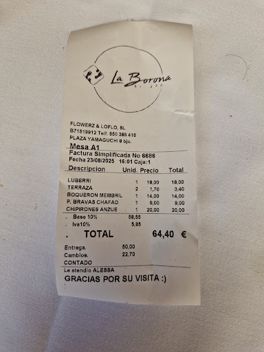 Salimos decepcionados, unos chipirones de anzuelo según carta,congelados porsupuesto que no sabían a nada, unos boquerones de lata que solo sabían a azúcar como los chipirones todo salsa y muy azucarada, pedimos botella de vino de la casa y nos cobraron 18 euros, nos cobran terraza cuando dentro no tienen aire acondicionado, porsupuesto no pedimos nada más y con hambre pagamos y nos fuimos diciéndoles lo que ocurría sin hacer ningún caso y solo estábamos dos mesas. No volveremos jamás evidentemente!