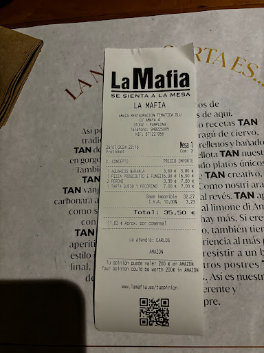 Read moreLa Mafia se sienta a la mesa in Pamplona offers a delightful dining experience with its diverse menu of Italian favorites. The pizza stands out with its fresh ingredients, crispy crust, and flavorful toppings, making it a great choice for pizza lovers. The cheesecake is equally impressive, featuring a rich and creamy texture that's a perfect end to the meal. The restaurant’s cozy ambiance and attentive service further enhance the dining experience. If you’re in Pamplona and craving Italian cuisine, this spot is definitely...