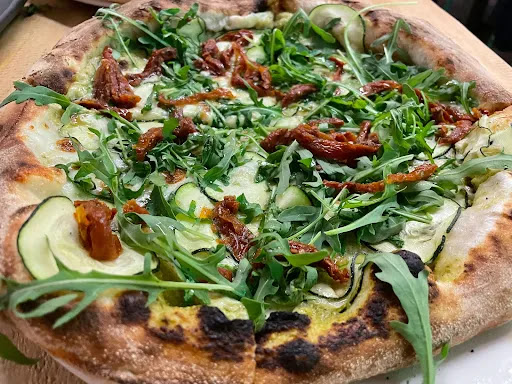 Nuestra elección fue, entre una amplia variedad de entrantes en las que también nos recomendaron la ensalada de burrata, las patatas trufadas: unas gajo caseras con lascas de parmesano, aceite de trufa y una crema trufada súper potente que es una delicia también como salsa para untar los bordes de las pizzas.