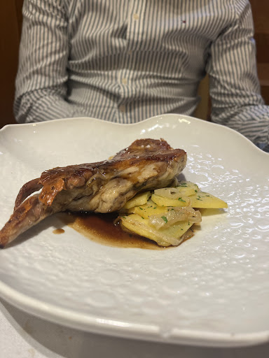 This is a lovely restaurant at Pamplona city center, at the entrance of the center and easily accessible, directly from the stop of bus number 4. The entrance gives and impression that the place is small , however, the seating area is on the first floor while the ground floor is were the kitchen is in addition to a small bar. Food wise, this was an excellent choice for us. The appetizers were fresh , portions were generous and the flavors are exquisite . They also got us two complimentary plates , olives 🫒 and special croquetas of queso and pera with sourdough bread ! The aged meat T-bone chuletón was perfect . They brought us a hot stone to cook it further to our liking since Spanish chefs always bring it rare to medium rare . We have ordered also the lechal lamb shoulder which was extra tender and juicy. The good thing about the chuletón is that you could order it by weight ! We ordered the 1.3 kg which is a generous potion for 2-3 persons. Potato and salad came for free with the order. We were four and ended paying 42 euros per person, which is not expensive for the quality of food and service. We have not tried the sea food or postres this visit , but it is for sure worth a second trip. The coffee con leche was rich, but I like it more hot than how I received it .