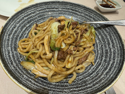 Los udon, además de tener la misma textura que un gargajo mañanero tras una noche de fumarme un paquete de Malboro, se anunciaban como "con solomillo". Atentos a la foto (y eso que el chef los colocó estratégicamente para que se vieran). 16,50 por un paquete de udon que te cuesta 1€ en la tienda y raspadura de ternera.