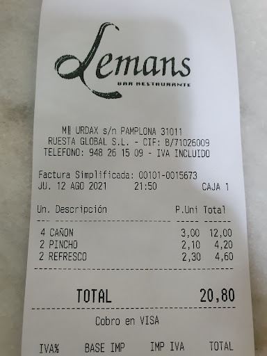 Read moreJamas en mi vida me encontrado con un dueño tan maleducado, soy de Pamplona y me da vergüenza encontrarme tipos tan malencarados. Despues de cenar en el bar de enfrente con unos amigos (tres parejas de 50 años) el jueves 22 de junio, fui a tomar un chupito a las 23 h al bar Lemans (el bar estaba abierto, y habia otros clientes en la terraza) El camarero no dijo q queríamos tomar, y salio.como un energúmeno el q creo será el dueño diciendo qu no se nos servia y q el bar estaba cerrado, tras lo cual se dio la vuelta y se fue. No vuelvo ni en veinte vidas. Una vergüenza de...