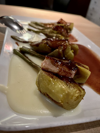 La sorpresa culinaria comenzó con una chistorra de Navarra deliciosa como aperitivo, seguida de unos pimientos de cristal que nos llevaron a otro nivel gastronómico. Las alcachofas con foie y crema parmentier fueron una explosión de sabores brutales, dejándonos con ganas de más.