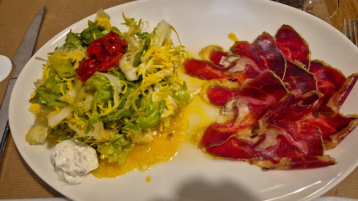 Read moreCurioso que en 2024 y pagando un menú de 40€ no tengan ni una sola opción vegetariana. Tras mucho pelear (al principio no estaban por la labor de preparar ningún plato vegetariano), nos sacaron 3 entrantes bastante escasos en cantidad y una pseudolasaña de verduras, la cual no tenía ninguna capa de pasta ni de bechamel, solo eran verduras con una capa de queso por encima. Nos dijeron que teníamos que haber avisado si había comensales vegetarianos, como si fuera algún tipo de intolerancia. Por supuesto, acabamos pagando el precio del menú "normal", que por cierto, no incluye bebida. Evidentemente...