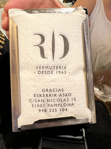 Situada en la calle San Nicolás, junto a la Plaza del Castillo en el centro de Pamplona, esta vermutería especializada en pintxos goza de gran popularidad, por lo que decidí ir a conocerla. Aunque vi algunas bolsas de aparcamiento de motos en las inmediaciones, me decanté por un parking subterráneo que hay justo debajo de dicha plaza. Contrasta la decoración moderna de color negro con algunas paredes de ladrillo visto que hacen de esta vermutería un conjunto atractivo. En la zona de barra hay mesas altas y más al fondo mesas bajas para sentarte más cómodo. Las consumiciones se piden en la barra aunque luego los camareros te la llevan a la mesa. El personal es muy agradable y el servicio de cocina muy rápido a pesar de que las mesas estaban casi todas ocupadas. Como me iba a resultar imposible probar todos los pintxos, decidí seguir las sugerencias del camarero que me atendió y pedí una ensaladilla que a pesar de no tener mucha mayonesa estaba muy buena de sabor; unas buenísimas croquetas de txangurro con una pincelada de alioli de ajo negro y por último la especialidad de la casa desde 1.963: frito de huevo, o como mi madre lo llamaba cuando yo era pequeño, huevo con bechamel. Parece simple pero hay que probarlo porque nunca habrás tomado otro tan cremoso y sabroso como este. Por su ubicación, la amabilidad de su personal, la calidad y presentación de su comida y la contundencia de sus pintxos, es un sitio más que...