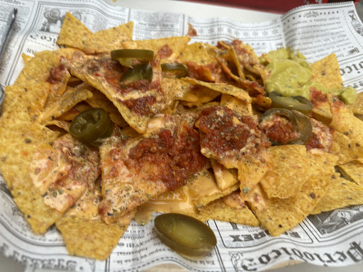 La carta de comida llama mucho la atención y decidimos probar los nachos y el perrito caliente (el picante). El chico que nos atendió, muy amablemente nos dijo que no le quedaba pan de perrito, que si nos importaba que fuera pan normal y sin ningún problema, aceptamos (también muy rico de esta manera). Comida sabrosa, bien elaborada y sin escatimar en cantidad. Tienen para acompañar una selección de salsas de...
