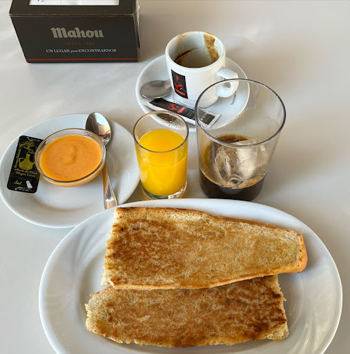 El desayuno muy rico y de calidad. El tomate natural y triturado con un poco de ajo, buenísimo. El zumo bien y el café igual. La atención ha sido inapropiada por un lado así como las promociones que tiene el local y explico a continuación por qué: En la foto que adjunto hay un cartel de promoción que tienen en la entrada del bar y es de un desayuno a 2,50€ que incluye café y el complemento que elijas (bollería,tostada) +zumo natural. Qué entienden ustedes con el cartel de la foto? Pues el procedimiento a la hora de cobrarnos ha sido el siguiente: 4,80€ por un café descafeinado, el zumo y la tostada de tomate con aceite. No os sentiríais estafados/as? El señor no ha rectificado pese a recordarle la promoción que tiene fuera expuesta. Simplemente creo que nos ha cobrado ese precio porque el café se lo ha pedido mi acompañante y yo he pedido el zumo y la tostada pero vamos, aunque haya dos personas hemos pedido un desayuno. ESTAFA. Si no haces oferta no cuelgues promociones para atraer a gente y que se sienta engañada. Añadir también que el desayuno lo pedimos en horario, a las 9:00am. Otro punto en contra que hago es que en pleno verano no hacen servicio de terraza. Tienen terraza fuera pero tienes que llevarte tú tu bandeja con...