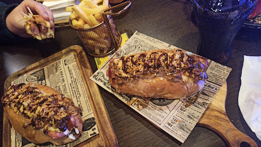 Read moreEl lugar bonito y atractivo. Fuimos 4 personas y pedimos 3 hamburguesas y un perrito sencillo. Éramos la tercera y última mesa del establecimiento (las demás estaban servidas a los 3 minutos de nosotros entrar). Se tardó 1 hora en salir el pedido. Por el tiempo, quise autoanimarme en que si se tarda tanto, debe valer la pena la espera. Nada más alejado de la realidad; 12, 13 y 14 euros (la peor). Las hamburguesas parecían una suela de zapato. Totalmente pasadas las carnes, increíblemente secas y la de 14 euros llamada "La Sabrosa", una hamburguesa bastante corriente. Incluye huevo pero, con yema dura, como las que te sirven en cualquier bar pero por 5,5. El sitio se llama Hot Dogs. Quizá el error fue pedir hamburguesas. Respecto a los perritos, absolutamente nada que decir, son espectaculares.