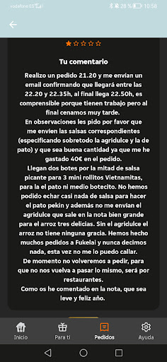 Read morePedido a Domicilio el cual ha tardado bastante, más de 40 minutos, ha venido con los rollitos de primavera blandos no, lo siguiente, parecían chicle, el arroz tres delicias tenía maíz, he pedido unos tallarines tailandeses y me han envido unos espaguetis con tomate, al llamar para reclamar me ha dicho literalmente " lo siento mucho y ya está " para mi que se han quedado sin tallarines tailandeses y han echado Tomate a cualquier mierda que les ha sobrado pensando que no me voy a dar cuenta, por que la mayoría de la gente no tiene ni idea de como son los platos, me han dicho que es una confusión, pero dime que plato oriental lleva tomate orlando por qué yo he ido mucho a comer en orientales y no, no se usa. Esque ni siquiera eran tallarines, eran espaguetis, es una vergüenza y no han ofrecido ninguna solución al llamar...