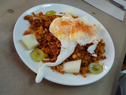 Pedimos migas de Pastrana (unas migas como las migas habituales -muy bien hechas-) pero con fruta fresca de temporada. La fruta le da a las migas un toque guay. Y encima de todo dos huevos fritos. Muy bien hechos, también (que no es fácil, digan lo que digan).