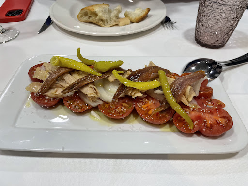Read moreFuimos un grupo de 10 personas a probar el menú del medio día. Para compartir nos pusieron un tomate raf con anchoas y piparras que estaba súper rico. Las piparras que no eran picantes quedaban súper bien. Seguimos con unos mejillones bien sabrosos, pequeñitos, bien limpios y jugosos. El siguiente plato fue un delicia, patatas con huevos rotos y foie, riquisimo. Para mojar pan. Un plato que espero recrear en mi cocina, no os lo perdáis. Para acabar el bacalao a la espalda que pedimos a la espalda estaba cocinado a la perfección, jugoso y aderezado con la salsa con ajo, delicioso. Hace dos semanas estuve en Portugal y no se le parecía en absoluto. Muy muy bueno. Por último compartimos un postre de fruta y tarta, buena combinación para bajar la comida. En general una experiencia muy correcta y donde la comida fue la...