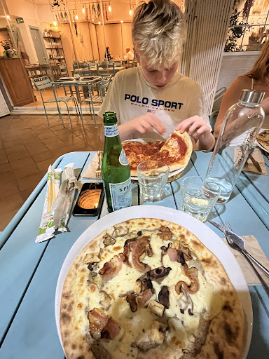 Desde el principio, los camareros siempre han sido muy atentos y simpáticos, pero ha habido muchos cambios en el personal a lo largo del tiempo. Aunque el servicio sigue siendo bueno, debo admitir que en los primeros años, en general, la atención era aún mejor. En una de nuestras últimas visitas, esperamos más de 30 minutos por 4 pizzas, lo cual fue un poco inusual. Entendemos que pueden tener un exceso de pedidos, pero nos sorprendió que no se diera prioridad a las mesas en lugar de los pedidos para llevar, especialmente considerando que preparan las pizzas en solo 4 o 5 minutos. Antes, solían servir aceitunas como aperitivo mientras esperábamos, pero ahora esto parece ser selectivo, por ejemplo, si pedimos refrescos, los traen, pero si pedimos agua, ya no ofrecen este detalle, independientemente de si alguien que pide refrescos va a acompañarlos con una pizza y alguien que pide agua va a pedir 4.