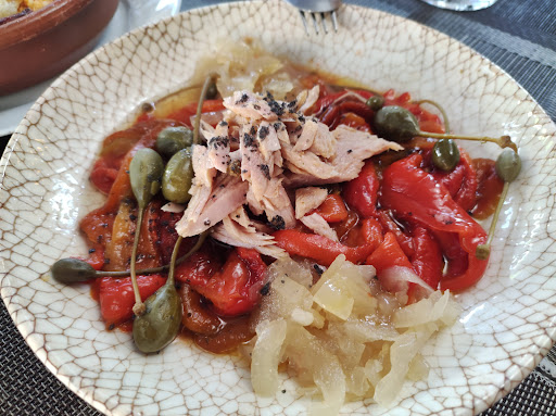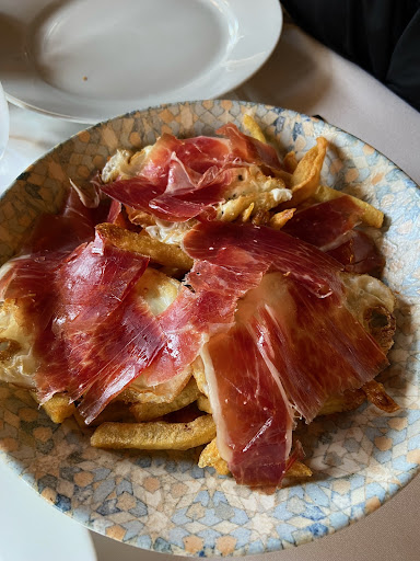 Read moreRestaurante situado en Patones de Arriba, luegar muy turístico en el que es muy complicado aparcar. Conviene reservar porque todos los restaurantes del pueblo se llenan. Llame para reservar y me dijeron que estaba todo completo y que tendría que esperar hasta las 15.45 pero no me pareció mala hora porque habíamos llegado tarde y así nos daba tiempo a visitar la zona. En torno a las 15.00 pasamos por allí y había una pesa libre por lo que pregunté y me indicaron que subiera unas escaleras y hablara con la que gestionaba las reservas, al hablar con ella me indico que no había problema y como era un día muy caluroso me enseñó la terraza que tenían el esa parte de arriba con bastante sombra y tenían pulverizadores de agua por lo que se estaba muy fresco, así que cogí la mesa en esa terraza y fue un acierto. Tenedlo en cuenta si vais un día de calor. Tenían un menú que estaba bastante bien por 26 eur por persona, eso sí, tened en cuenta que es sin bebida, pero decidí comer de carta. Primero pedimos una ensalada de pimientos con ventresca que estaba muy buena, ya que se notaba los pimientos asados caseros y estaba bien aliñada. A continuación pedimos unas migas y aunque estaban ricas, con huevos que se notaba de calidad, tampoco eran las mejores que he comido. Luego pedimos la manitas de cerdo rellenas de boletus y foie, el plato estaba muy bueno, casero, pero no sé apreciaba el foie y me resultó un poco pesado. En general todo estaba rico y con productos de calidad y comida casera, por lo que si vas por Patones te lo recomiendo porque vas...