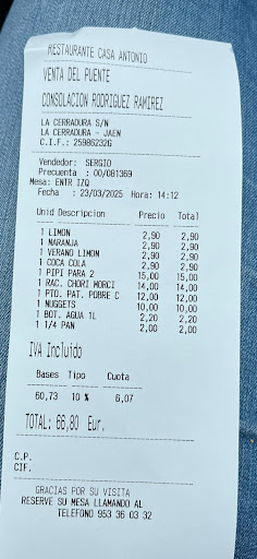 Read moreEstuvimos en agosto en Casa Antonio. Es un restaurante al lado de la carretera antigua que comunica el pueblo de Cambil con Jaén. Visitamos el lugar un domingo con lo que no había menú sino carta. En general los precios son muy elevados para la calidad que se sirve y el lugar en qué nos encontramos. Tienen dos salones de tamaño medio bastante acogedores y limpios y temperatura agradable. El servicio de los camareros bastante bueno. En el apartado de comida diría que la calidad es correcta, aunque las raciones son algo escasas comparados con otros lugares cercanos. Llegamos sobre las 2 de la tarde, habiendo reservado el día anterior y pedimos solomillo y ya no tenían. Creo que en un lugar así es bastante imperdonable. Después muchos de los platos son ahora por encargo, como los arroces, tal como se ve en la carta. Tampoco tienen lomo de cerdo, lo cual no entiendo, porque no es algo tan excepcional. El pan lo cobran a parte. Las bebidas las cobran a 2.80 (precios de 2024). Realmente son precios comparables a los de algunos restaurantes de calidad similar en una gran ciudad como Barcelona. En el apartado de postres más de lo mismo. Poca variedad, caros y calidad escasa. Por ejemplo la tarta de whisky la sirven prácticamente congelada. Son detalles que hay que cuidar si quieres que la clientela repita...En líneas generales diría que tiene que mejorar muchos aspectos, especialmente precios y variedad. No lo...