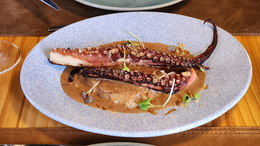 Spectacular food and service. We ordered the Tartar de vieira y gamba roja con aove y cítricos (scallop and shrimp tartare), the Pulpo a la parrilla con crema crujiente de patata (Grilled octopus with crispy creamy potatoes), the Black Angus steak and, for dessert, and dessert - a white chocolate and mango dish and two scoops of ice cream.