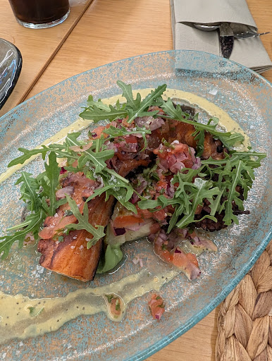 Empezamos con la pata de pulpo, que venía servida con una presentación bastante atractiva: sobre una base de crema, con rúcula y pico de gallo. A pesar del buen aspecto, el sabor no terminó de convencerme. No estaba mala, pero me dejó indiferente, quizá porque esperaba algo más sorprendente en un entorno así.