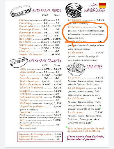 Read moreLo pintan muy bien con 4 estrellas y media pero tiene mucho que desear. La hamburguesa el carme muy correcta con una buena combinacion de 2 quesos y el mallorquín en pan de barra muy bueno, pero sin ser nada del otro mundo eso les mereceria 4 estrellas, pero la cosa cambio cuando pagamos. Pedimos la cuenta 14'70€ y pagamos pero el subconsciente me dijo que la hamburguesa en la carta ponia 7€ i cuando me trajeron el cambio ,(sin el tiquet) le comente que en la carta ponia 7€ i creia recordar que en el tique ponia 7'50€. Me volvio a traer el tiquet y efectivamente cobraban 7'50€. Respuesta de la chica. "Es que hemos subido los precios y no hemos tenido tiempo de cambiar la carta". No me gusto pero no monte ningun pollo. Nos levantamos y cuando nos ivamos me trajeron los 50 centimos. Despues al comprovar de nuevo la carta vi también diferencia en el precio de la caña. Adjunto fotos. Recomiendo comprobar bien los precios del tiquet con la carta. No volveremos....