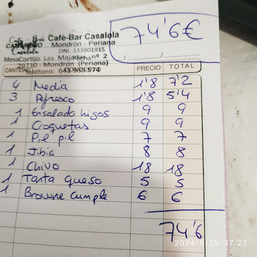 Read morePuedo dar dos opiniones de este café-bar. En el puente de diciembre en concreto, hemos comido en festivo y en laborable. En festivo no hay menú y sí platos a la carta. Nos llevamos una grata sorpresa en cuanto a la cantidad de la comida empleada y precio contenido aunque no tirado, como algunos pueden pensar, pero platos buenos y buen servicio con los camareros. En laborable hay posibilidad de menú y es económico y muy completo. En laborable no sé si es así siempre o coincidió, pero hay menos personal camarero. La cuenta entre a la carta o menús, es considerable (lo vale), pero con el menú no te quedas corto, 70€ almuerzo a la carta (4 personas) , 38€ con menús, aproximadamente. Recomiendo parar y comer, a nosotros (famila con niños) nos solucionó la papeleta. Hay sitio más que suficiente para aparcar en un llano. Dispone de terraza cubierta con toldos, también mesas totalmente al exterior o en el interior. Luego o antes, frente al bar, está la cooperativa de aceite de Mondrón con muy buenos aceites Virgen extra verdial o picual-hojiblanca, sin...