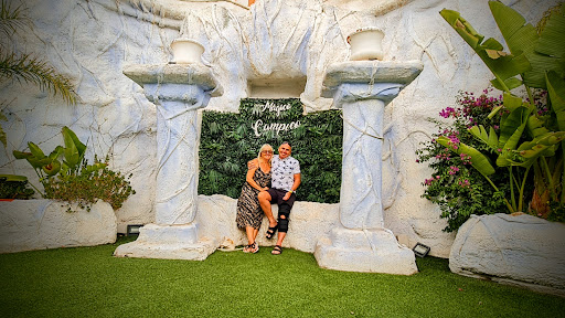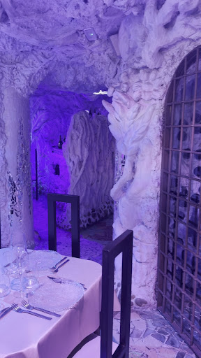 Según nos explicaron, lo que era un antiguo bar en una casa de planta baja, tras casi tres años de trabajos, se ha transformado en un espacio único compartimentado en estancias, huecos o salitas que aprovechan cada rincón, siendo diseñado por uno de los propietarios con paredes, techos y suelos elaborados con escayola y restos de espejo y losa. La acertada iluminación en diferentes colores y algunos adornos y figuras dan el toque final creando un ambiente muy acogedor.