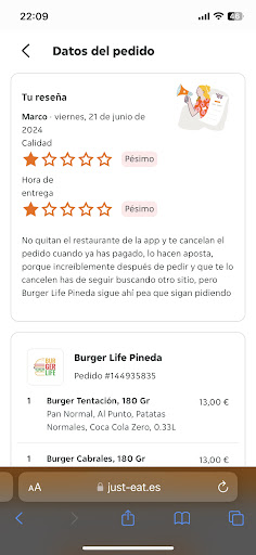 Read moreExplicare mi valoración. Para poneros en contexto, mi descontento tiene su origen porque al pedir, en varias ocasiones, me cancelan el pedido debido a que estan a saturados (algo normal y que se puede entender), sin embargo el problema viene debido a que no son capaces de cerrar las apps donde realizas el pedido por lo que le siguen entrando pedidos y cobrando al cliente. Por ese motivo deje de pedir, ya que me había ocurrido varias veces, y claro JustEat, Globo, etc, no te devuelve el dinero hasta varios días después, obligándote a gastar nuevamente en otro pedido, en otro sitio. Pero la soberbia de las respuestas que recibes por parte de los empleados es la gota que colma el vaso y origina la valoración. Os cuento, hoy mi madre, después de que yo llevara meses sin pedir en este establecimiento, realiza un pedido al restaurante sin tener yo nada que ver. Hasta ahí todo bien, pero al abrir la bolsa del pedido se encuentra una nota escrita haciendo referencia a mi (que adjunto en las imágenes). Una situación totalmente surrealista ya que el pedido no lo realizo yo y ella no tiene nada que ver. La situación ahora es que mi madre no sabe si comerse la comida por si le han hecho algo. Una situación muy desagradable y que me parece lamentable. Adjunto capturas de mis pedidos cancelados, de la nota que ha recibido mi madre y de mi reseña en JustEat después de varios pedidos cancelados en diversos momentos. Todavía no salgo del asombro. Por cierto me llamo...