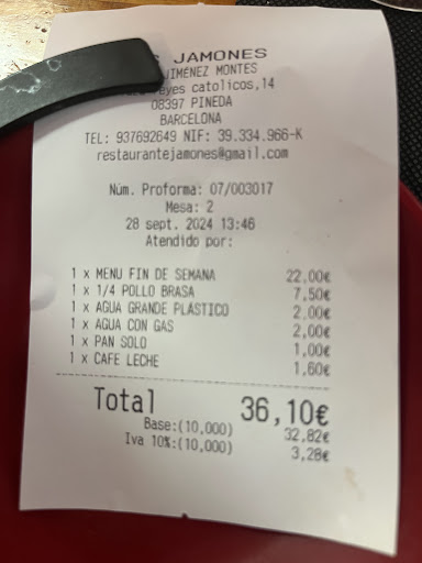 Read moreManger à Los Jamones, c'est avant tout s'écarter du front de mer hyper touristique où sans réservation on ne vous considère pas ! Dans cette maison, on arrive, on demande si l'on peut manger et c'est parti pour une belle expérience. Le service est top, d'une gentillesse et ça déconne simplement même avec l'écart de la langue. Ensuite au niveau de la carte, même si nous avons testé que certains plats, je peux vous dire que tout doit être bon car c'est typique catalan, fait maison et c'est vraiment délicieux ! Gin tonic Puertos Infias strawberry à 7€ franchement c'est top, quelques tapas pour accompagner, je vous recommande l'assortiment de croquettes, juste incroyables et les oeufs brouillés. Ensuite grillade de porc ibérique avec l'accompagnement typique catalan à savoir salade avec poivrons au top ! Au total pour 30€ vous avez le cocktail, quelques tapas, le plat, le dessert et le café. Petite terrasse extérieure dans une esplanade simpliste mais à Los Jamones on vient avant tout pour la qualité des assiettes et pour nous c'est l'essentiel. Nous y reviendrons les yeux fermés. Si vous êtes sur Calella, n'hésitez...