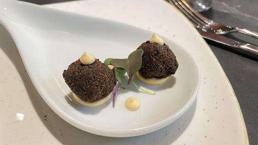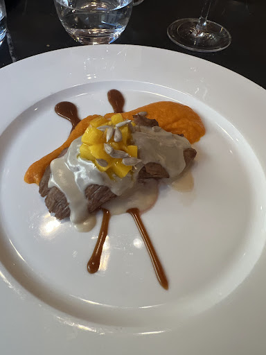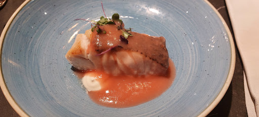 Read moreNo esperábamos grandes cosas de un restaurante de hotel y finalmente tenemos que reconocer que el nivel de la cena fue alto. Muy bien de punto y sabor del mero a la brasa con velouté cítrica de cava rosado y piña caramelizada. Lo mismo se puede aplicar a la presa lacada con praliné de almendras, crema de turrón y soja, boletus y espuma tibia de patatas al azafrán. Muy buena.